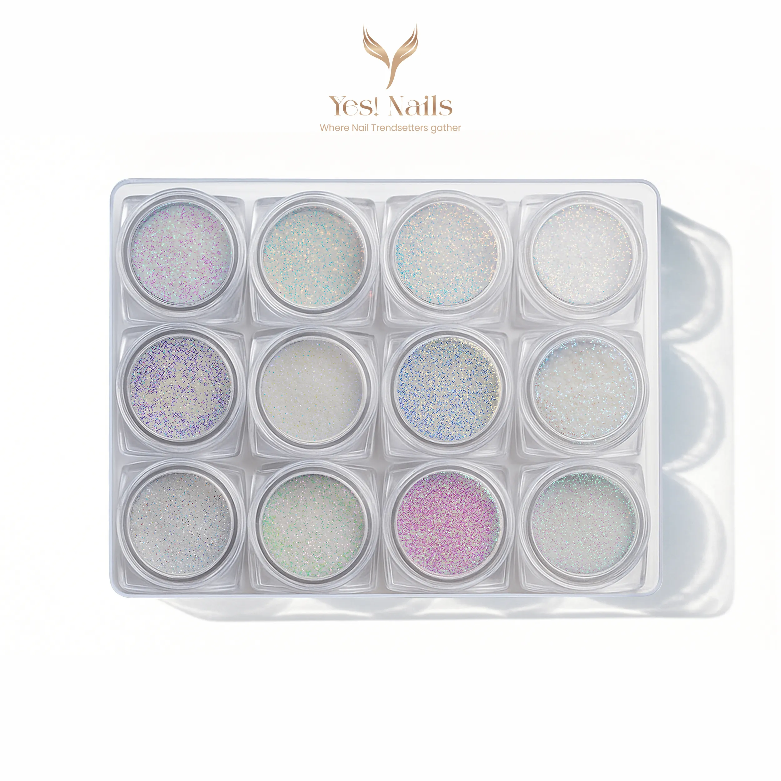 - 12 pastel aurora shades – from pearl white to pink, blue, yellow, and green